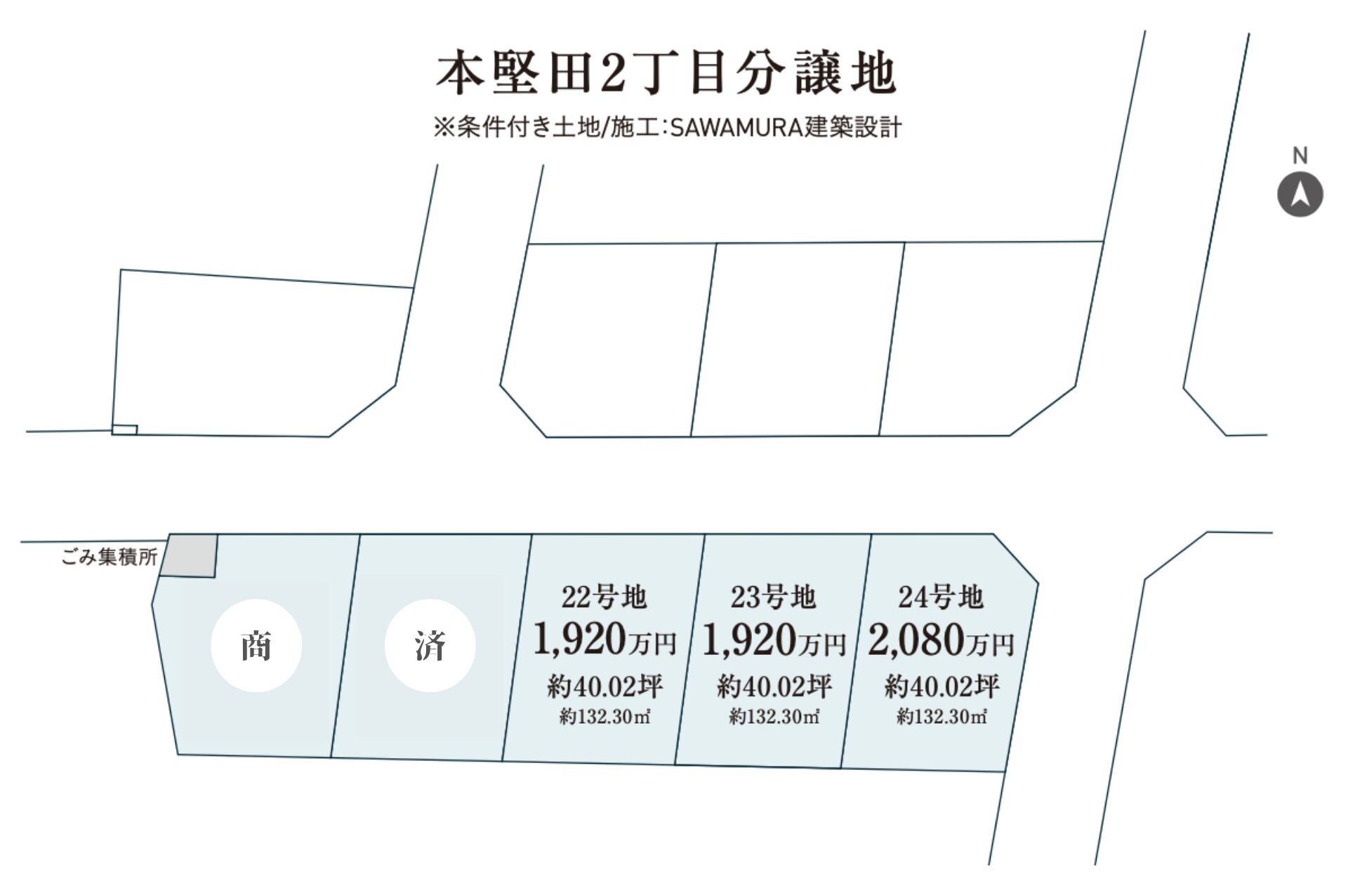 【物件概要】所在地/滋賀県大津市本堅田2丁目 ●交通/JR湖西線「堅田」駅徒歩14分(約1,050m) ●用途地域/第一種住居地域 ●都市計画/市街化区域 ●地目/宅地 ●現況/更地 ●建ぺい率/60% ●容積率:200% ●総区画数/5区画 ●販売区画数/3区画 ●土地面積/132.30m²(約40.02坪) ●販売価格/1,920万円~2,080万円 ●設備/電気:有、 ガス:都市ガス、水道:上下水道有、〈別途費用〉上水道加入金、下水道分担金 ●接道状況/道路幅:6m ●その他法令/景観法・文化財保護法 ●引渡予定/相談 ●売主/株式会社澤村 ●<本社>〒520-1121滋賀県高島市勝野1108番地3 ●建設業許可/滋賀県知事許可(特・般-3)第80123号 ●宅地建物取引業者免許/滋賀県知事登録(12)第1267号 ●一級建築士事務所/滋賀県知事登録(カ)第126号