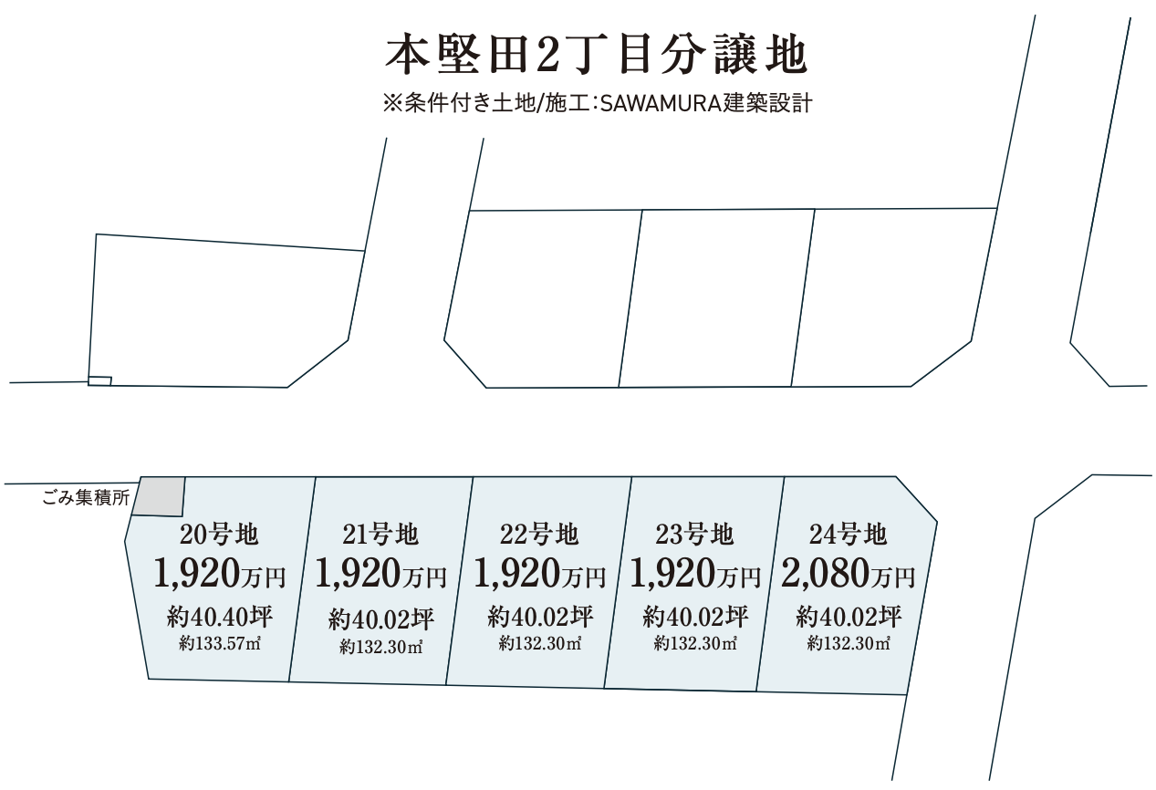 ●建築条件付売地について/この土地は、土地売買契約締結後3ヶ月以内に、売主又はその指定する者と住宅の建築請負契約を締結していただくことを条件として販売いたします。この期間内に住宅の建築請負契約が成立しなかった場合は、土地売買契約は白紙となり、受領した金銭は全額無利子で返却致します。