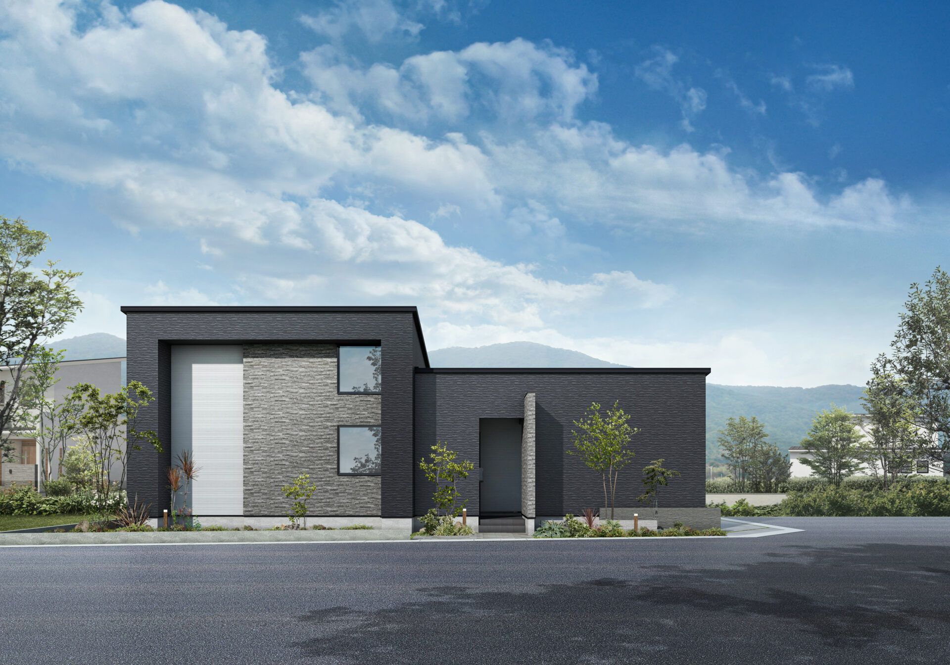 土地の形を活かした横幅約15メートルの伸びやかなファサード。ブラックやグレーでまとめた外壁が、都会的で洗練された佇まいを作りあげています。内観もモノトーンで統一したシンプルな空間は、住まいの中心にベッドルームを配置しました。日光をなるべく遮り間接照明にこだわることで、まるで上質なホテルに泊まっているような住空間になっています。