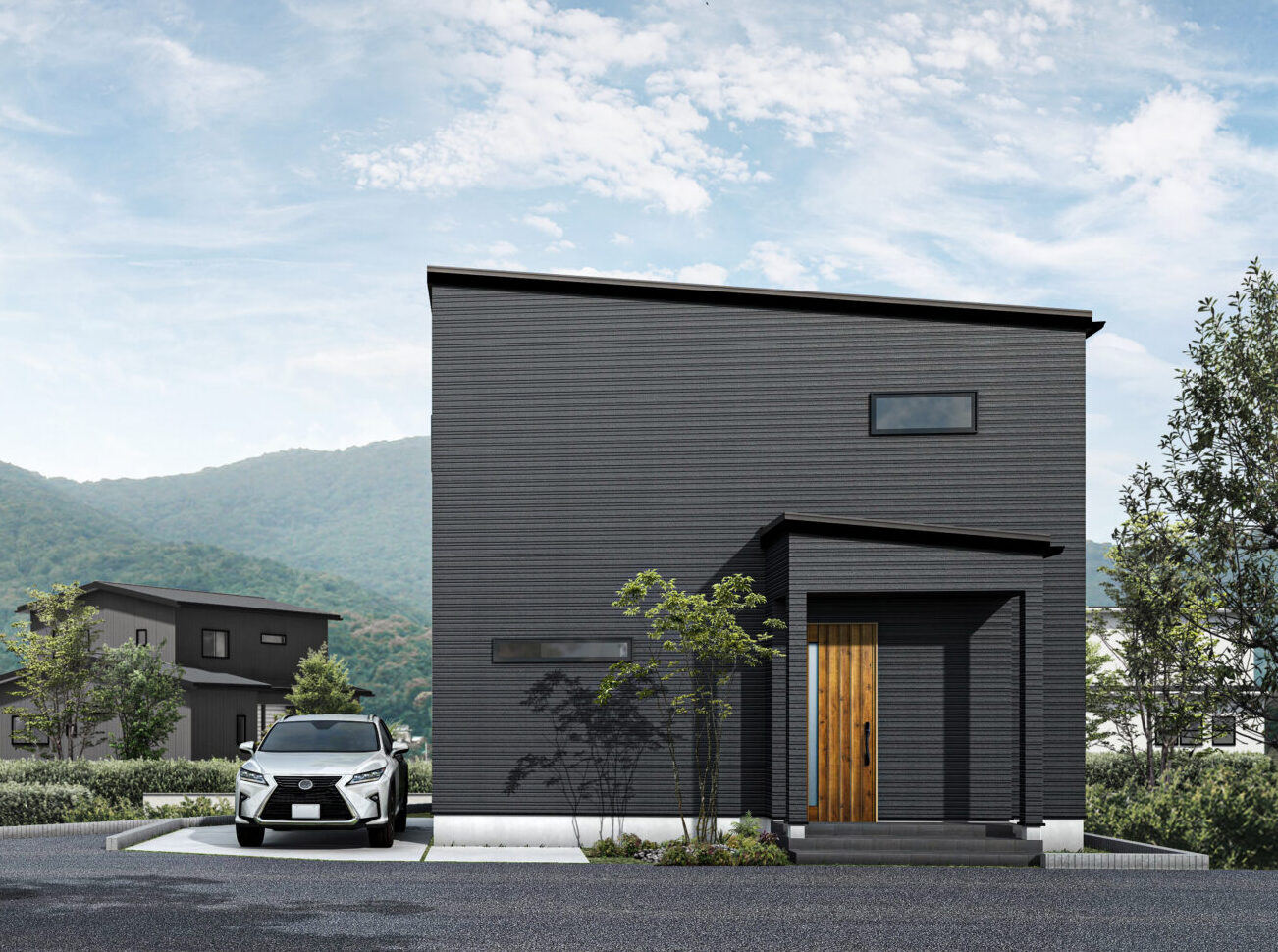 ブラックのキューブ型が目を引く、洗練された佇まい。最大の特徴は、家事や子育て、来客対応まで、日常のすべてを1階でスムーズに完結できる機能的なプランニングです。LDKは大きな吹き抜けから光が降り注ぎ、開放感たっぷり。アイランドキッチンに立つと、リビング全体だけでなく、隣接する畳コーナーまで視線が届き、お子様を優しく見守れます。