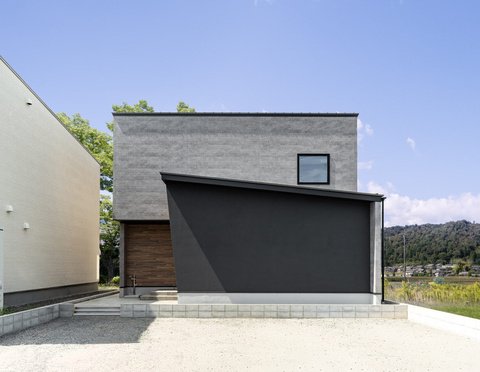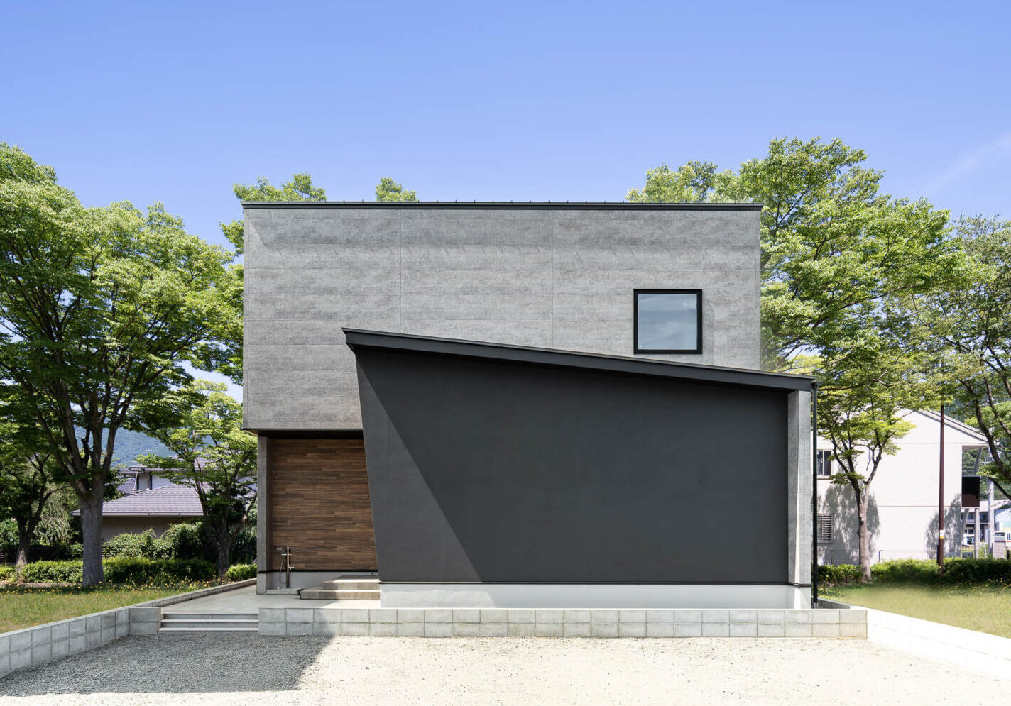 シンプルなキューブ型に斜め壁を組み合わせたスタイリッシュなファサードデザイン。