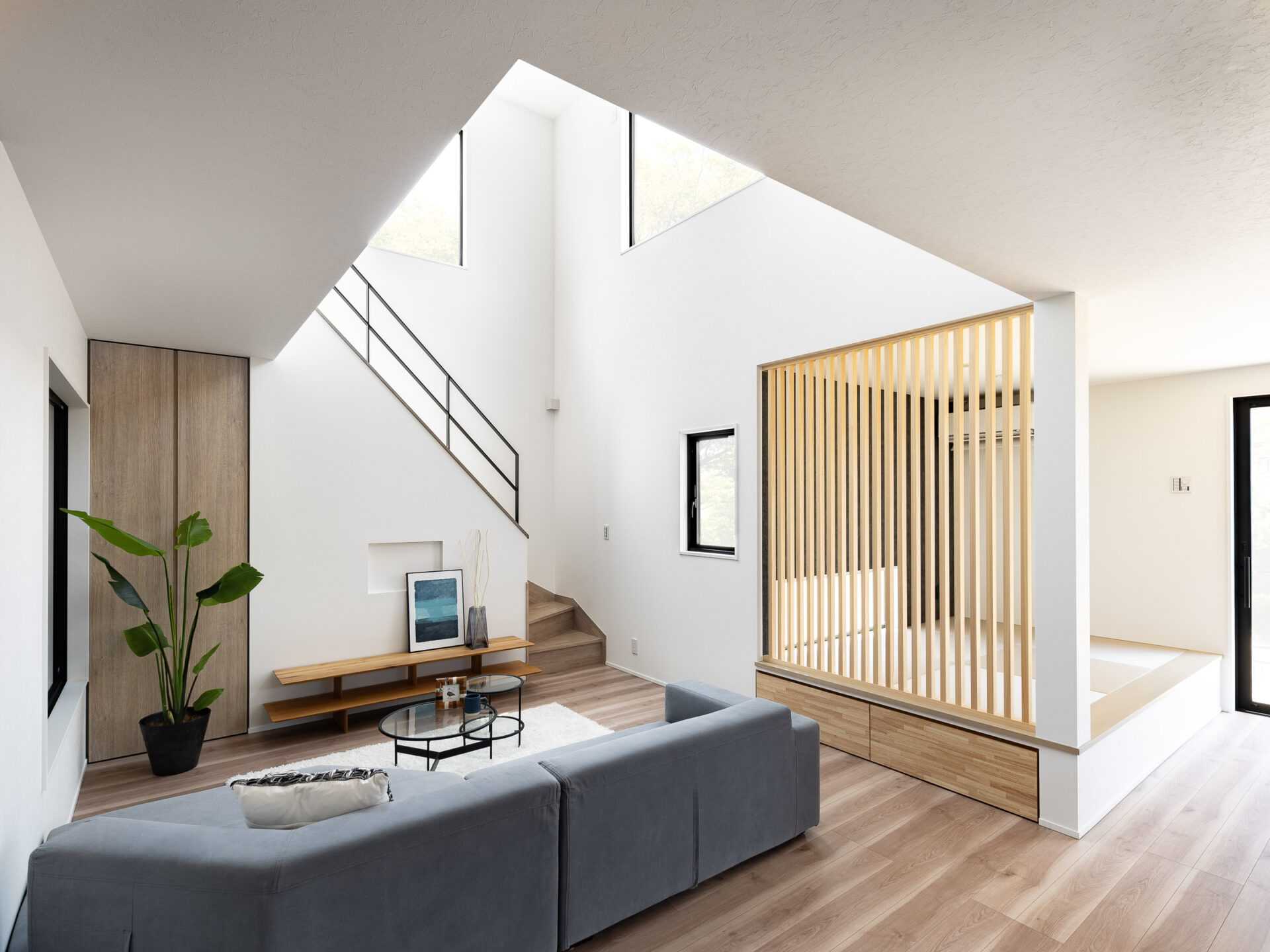 グレーをベースに木目をアクセントに加えて全体的にはシックな印象に仕上げました。部屋の隅々まで明るくする吹き抜け
