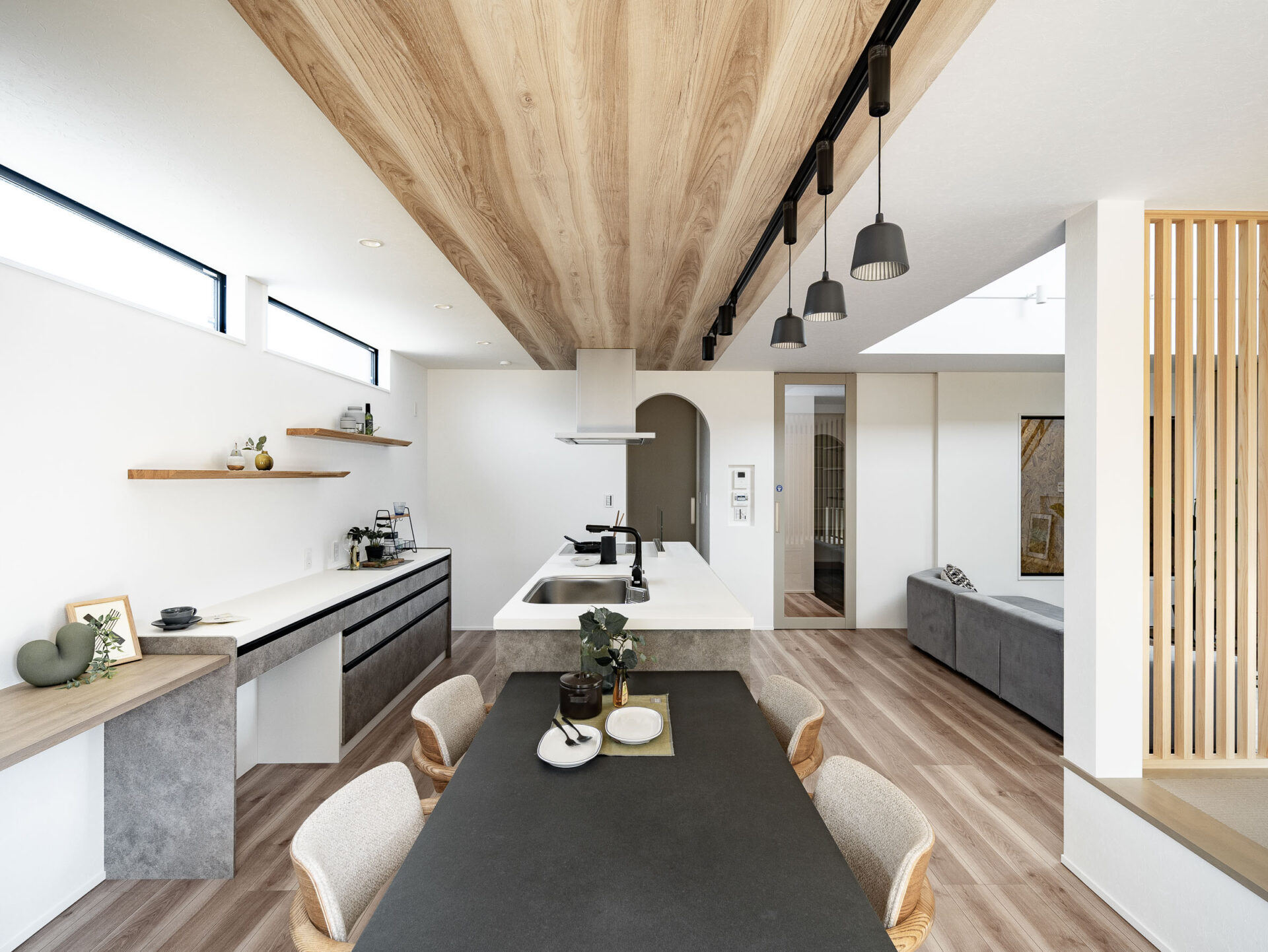 キッチンから続く木目の下がり天井が、LDK全体のアクセントになっています。CONTACT US