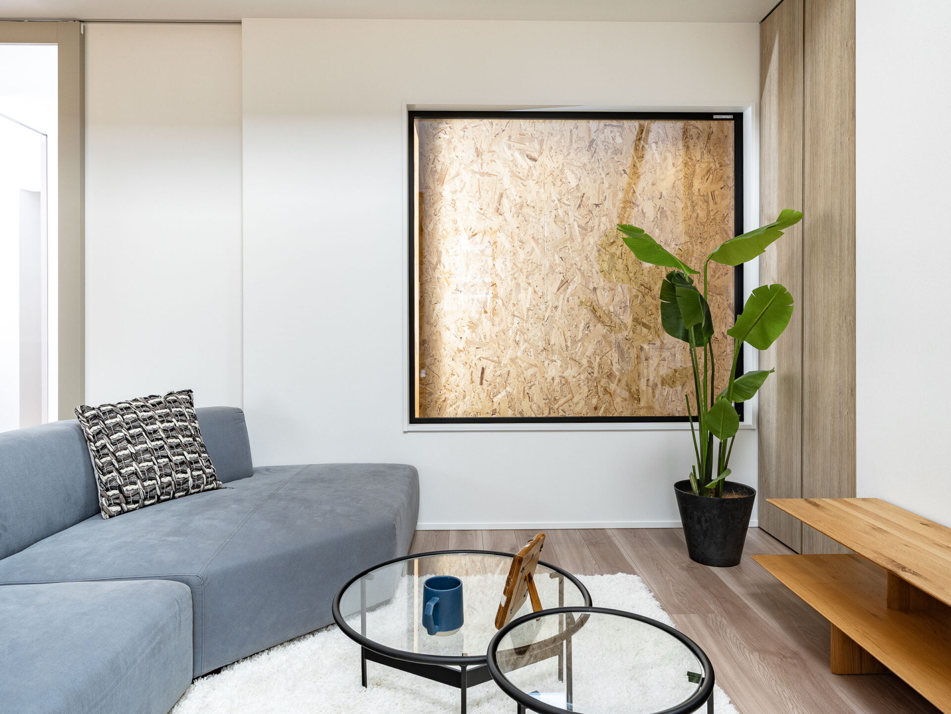 リビングに設けた大きな窓からは、飾ったサーフボードや道具類が見えるようなっています。